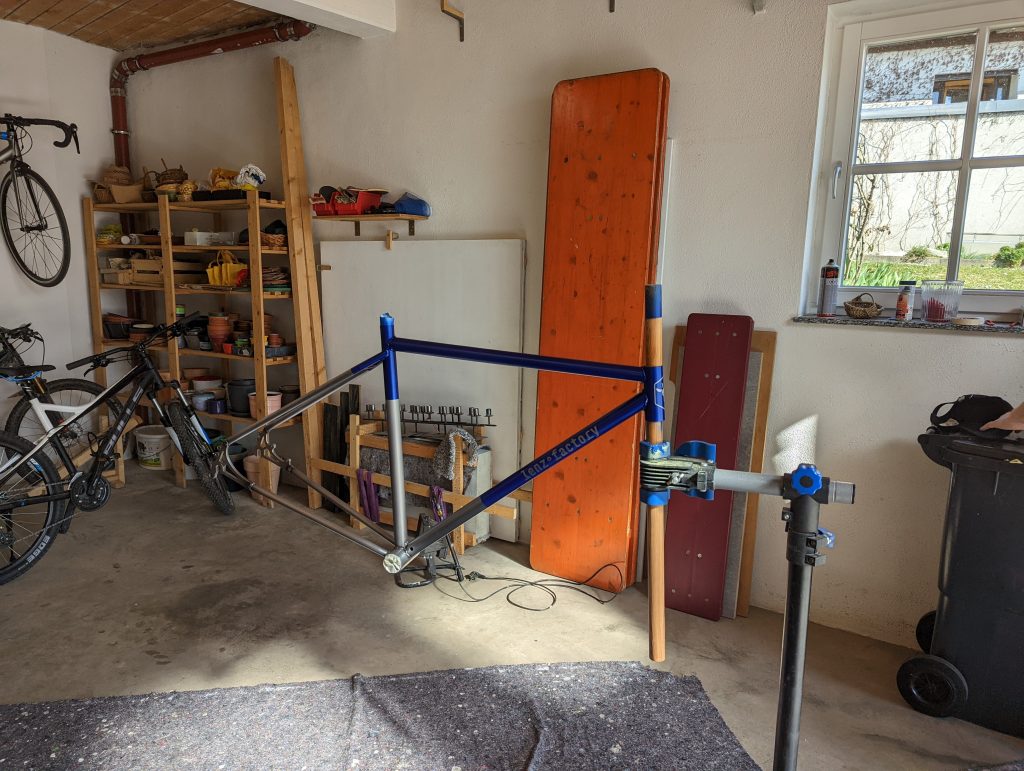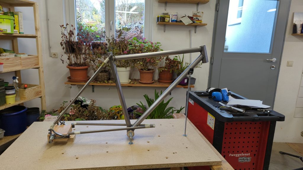 Kettenstreben und Sitzstreben so ausrichten, dass die Nabenbreite stimmt und genug Reifenfreiheit vorhanden ist, aber auch das Kettenblatt nicht streift. Gar nicht so leicht.