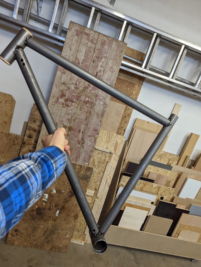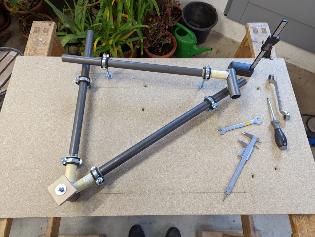 Das vordere Rahmendreieck.Gefeilt, gedreht, gefräst und zusammengeheftet.