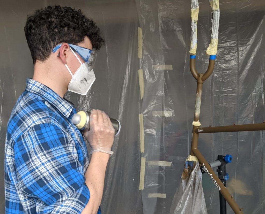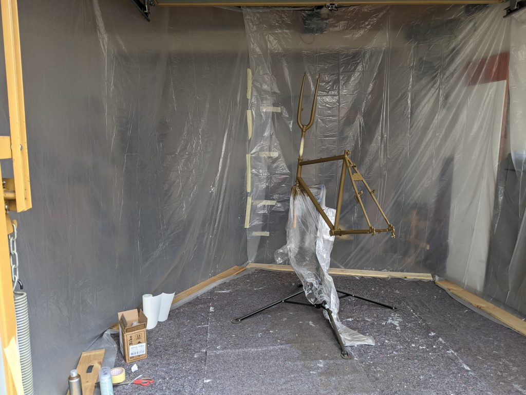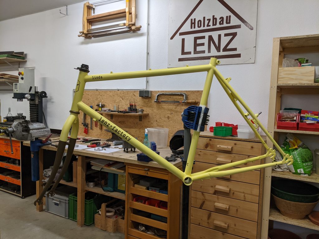 Nach dem Abschleifen, was sich als aufwendigste Arbeit des ganzen Projekts herausstellte, mussten noch die rostigen Stellen gesondert behandelt werden. Dann stieg die Aufregung, weil die Lackierung näher rückte und man erste Ideen davon bekam wie das Fahrrad irgendwann mal aussehen würde.
